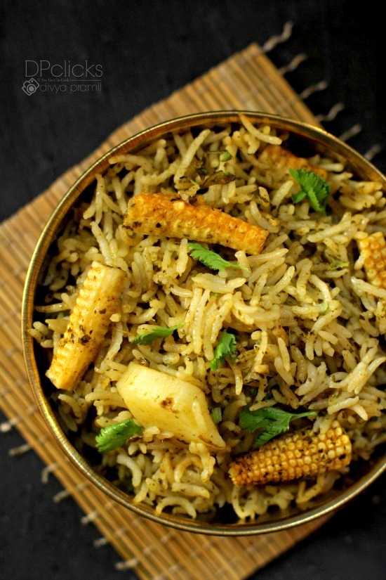 “**Babycorn Biryani** from AJ Restaurant is a unique and flavorful dish featuring tender babycorn pieces cooked with aromatic basmati rice and a blend of spices. Garnished with caramelized onions, fresh herbs, and a touch of saffron, this biryani offers a delightful and satisfying vegetarian option that’s perfect for any meal.”